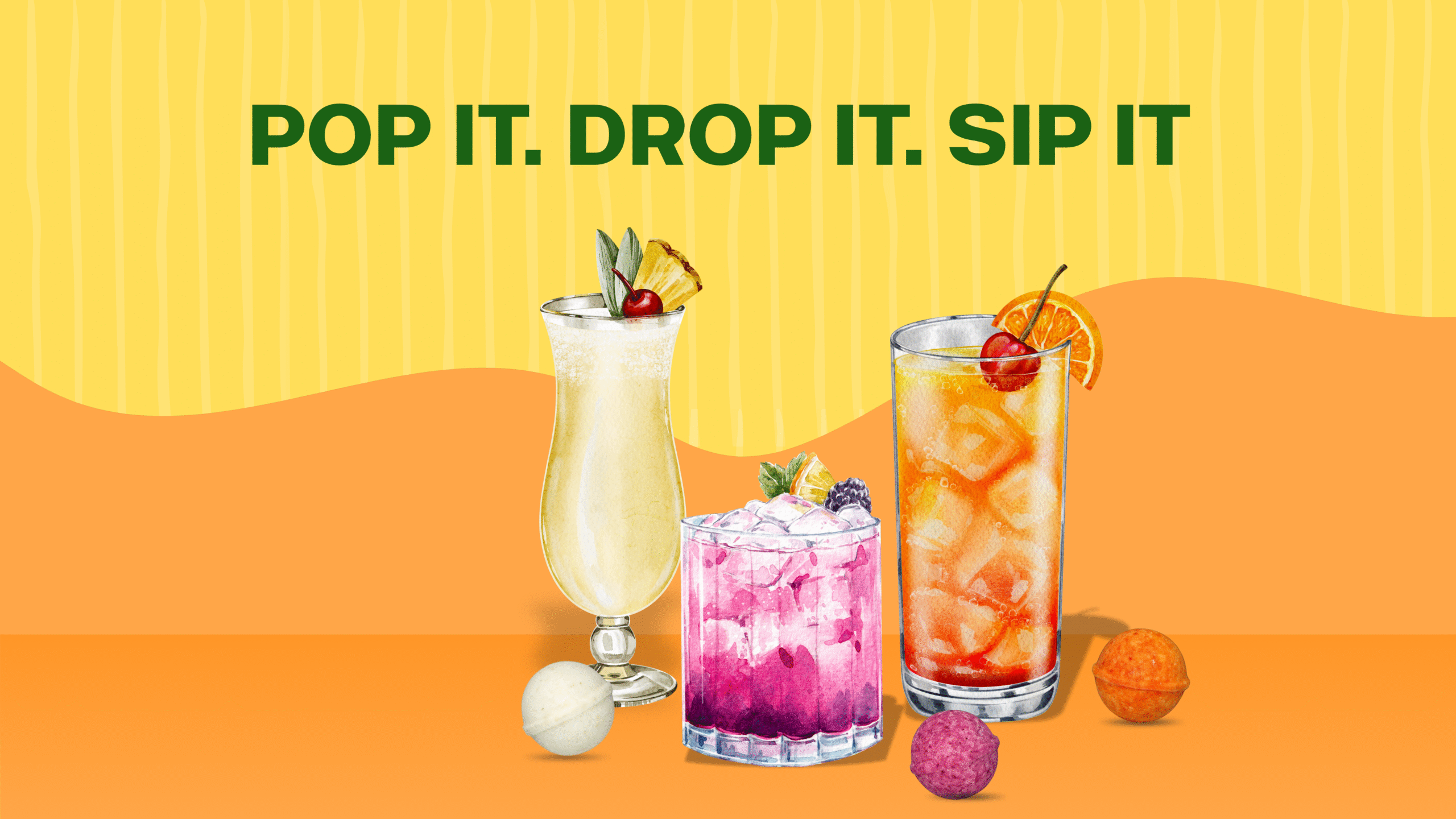 Enjoy your cocktail or mocktail with the 3 easy steps: just pop drop it, sip it